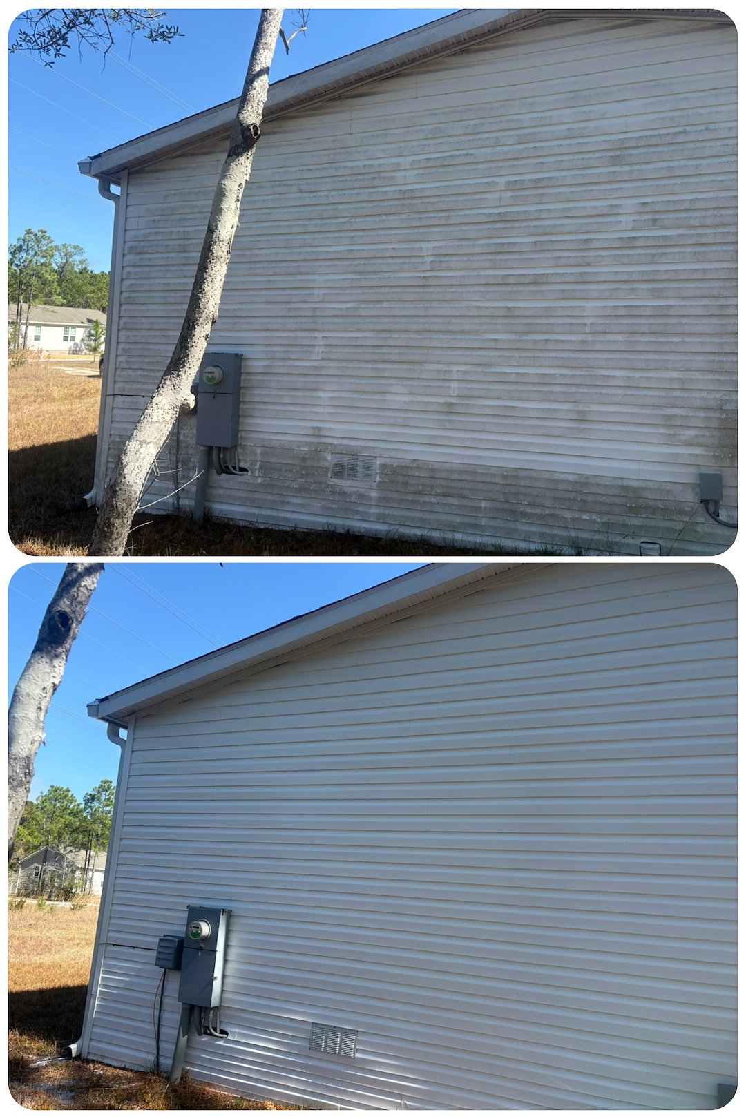 For this property we performed a professional soft wash to safely remove the algae and surface grime. The soft wash restored the exterior to a clean, uniform finish, bringing back the original color and removing the streaking that had built up. Because the method is low pressure, it cleaned the siding without risking damage to the material or seams.