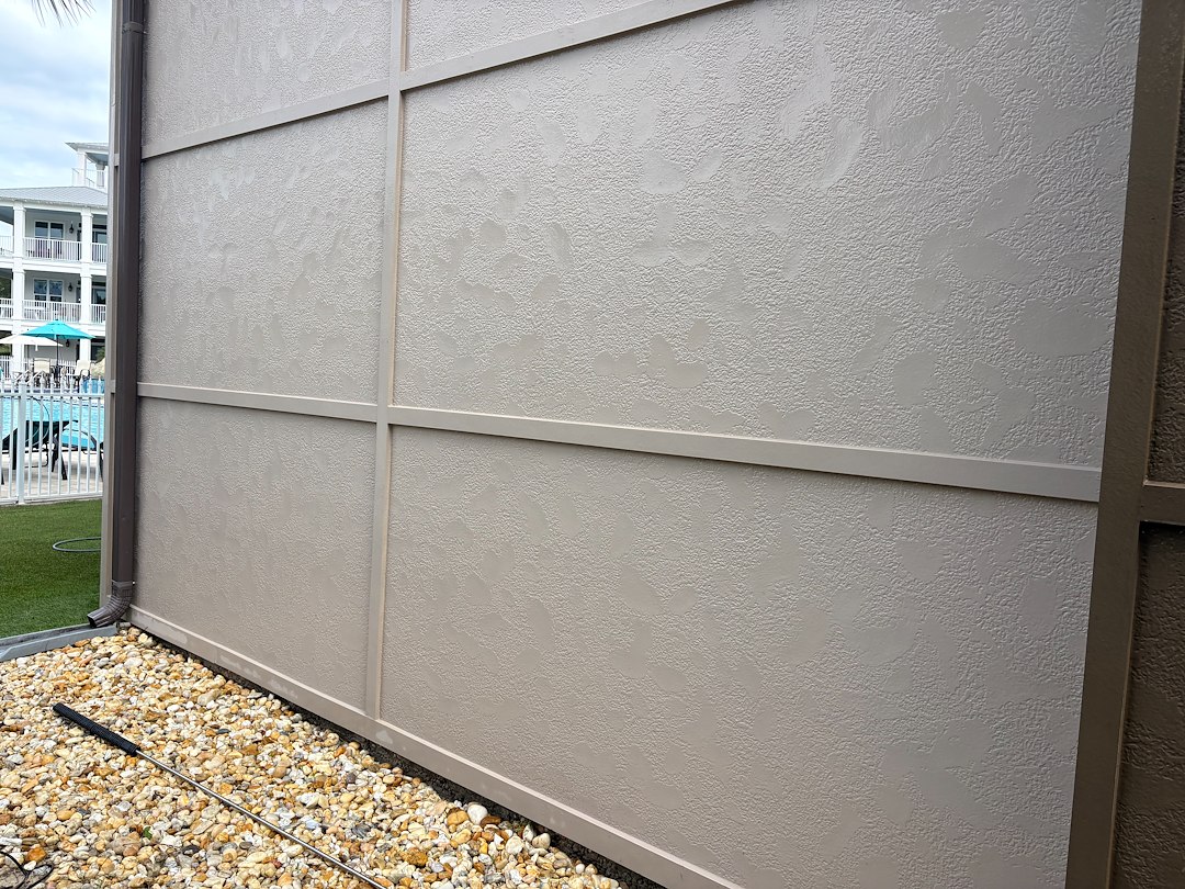 This house washing project in Santa Rosa Beach, Florida focused on cleaning a stucco exterior wall that had developed buildup and discoloration over time. In coastal environments like Santa Rosa Beach, stucco surfaces are often exposed to moisture, humidity, and organic growth.