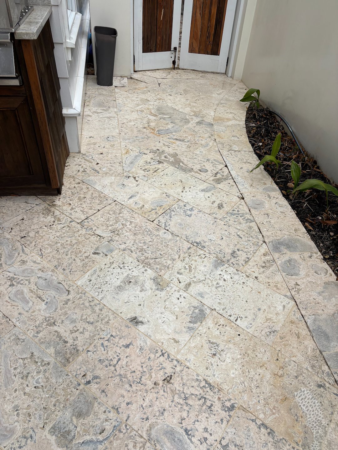 The cleaning process began with the application of a specialized treatment designed to break down algae and organic contaminants embedded within the stone surface. Natural stone requires careful cleaning methods to ensure the buildup is removed without damaging the material or affecting the integrity of the stone.